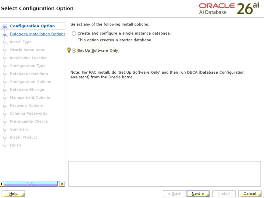 [root@oracle26ai ~]# [root@oracle26ai ~]# mkdir -p /u01/app/oracle/product/23.26/dbhome_1 [root@oracle26ai ~]# mkdir -p /u01/app/oraInventory/ [root@oracle26ai ~]# chown oracle.oinstall -R /u01/app/oracle/ [root@oracle26ai ~]# chmod 775 /u01/app/oraInventory/ [root@oracle26ai ~]#